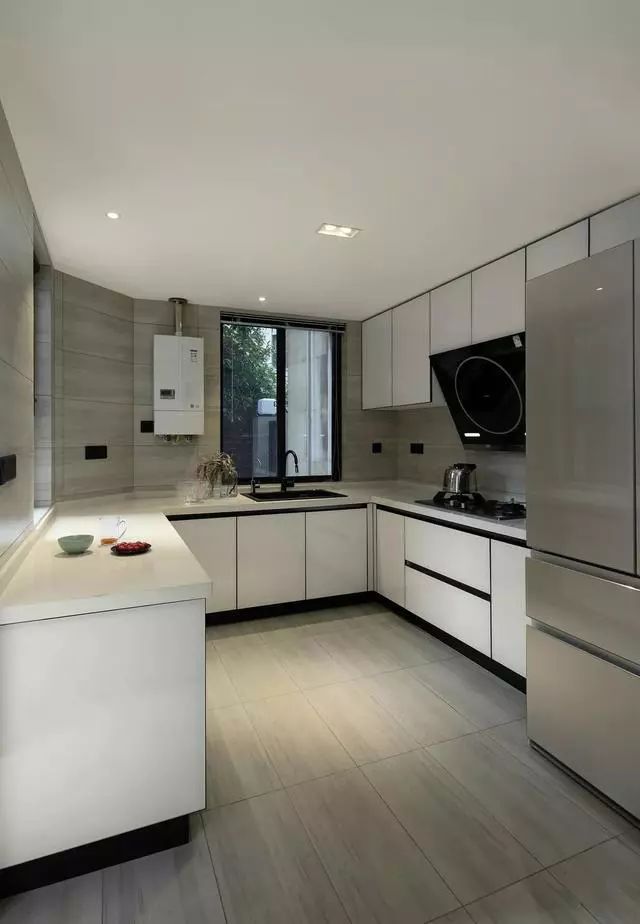 由于男女主人不同的烹饪爱好,设计师特地打造了中西合璧的厨房。西式的厨房由中岛柜和餐厅相隔,微波炉、烤箱等皆安置在开放式的西厨中;冰箱、抽烟机等则安放于玻璃门内的中式厨房里。
